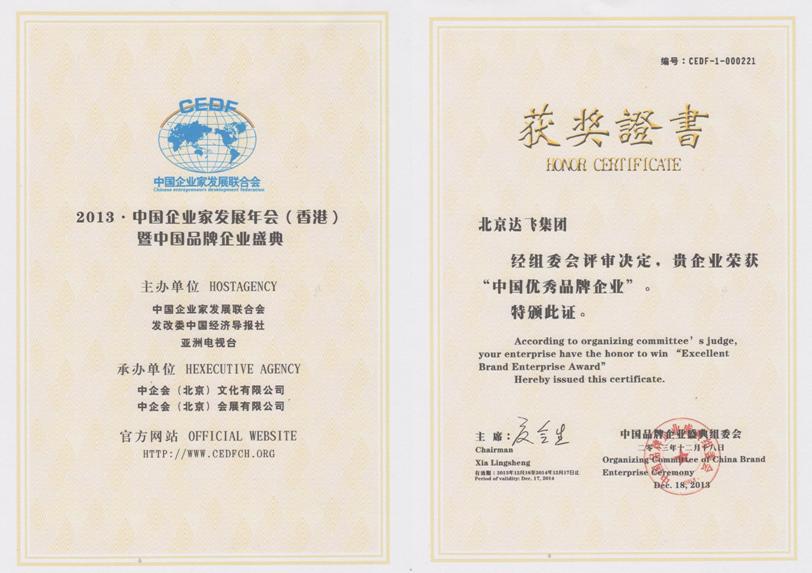 中國優(yōu)秀品牌企業(yè)證書